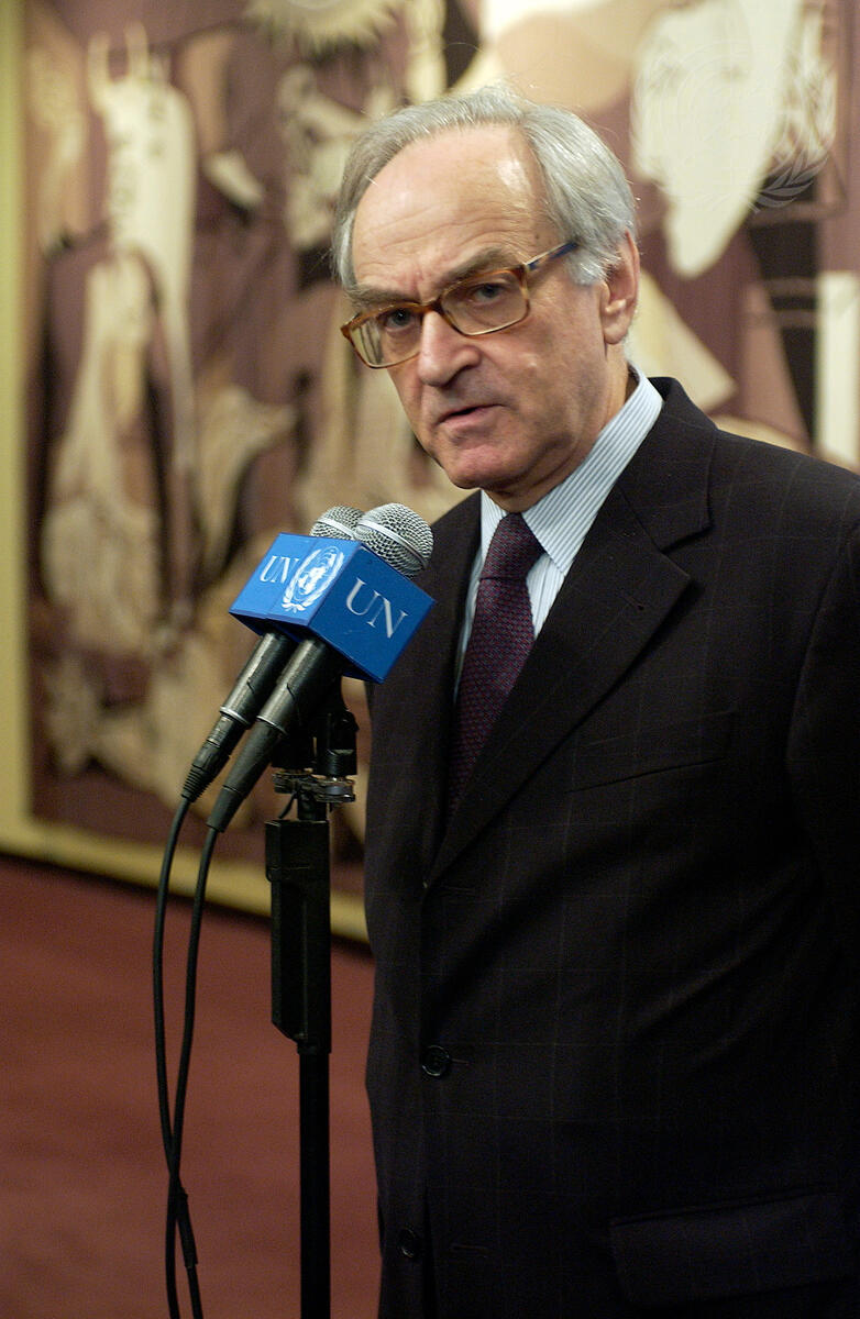 Jean-Marc de La Sablière, Permanent Representative of France to the United Nations, briefs journalists outside the Security Council chamber, at UN Headquarters in New York.