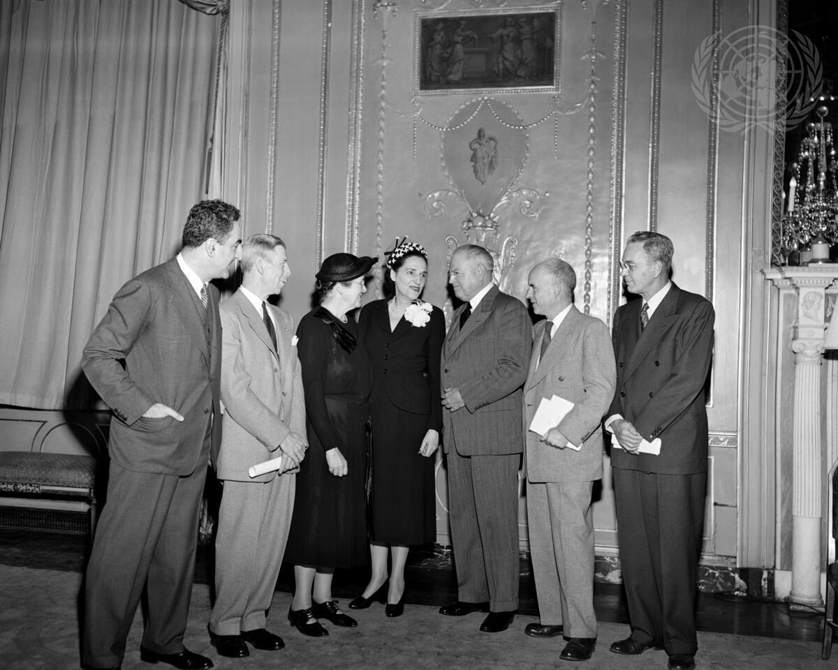 At the ceremony held at the Waldorf-Astoria Hotel are, left to right: Dr. Charles Malik, Lebanese representative on UN Commission on Human Rights; Major-General Walter A. Wood, Chief of the IRO Mission to the United States; Dr. Martha Eliot, Assistant Director-General of WHO; Miss Dorothy Shaver, President of Lord & Taylor, who presented the awards; Mr. Warren Austin, United States Representative to United Nations; Mr. Gove Hambridge, Chief of Information, FAO, and General Lowell W. Rooks, UNICEF Fund-Raising Coordinator.