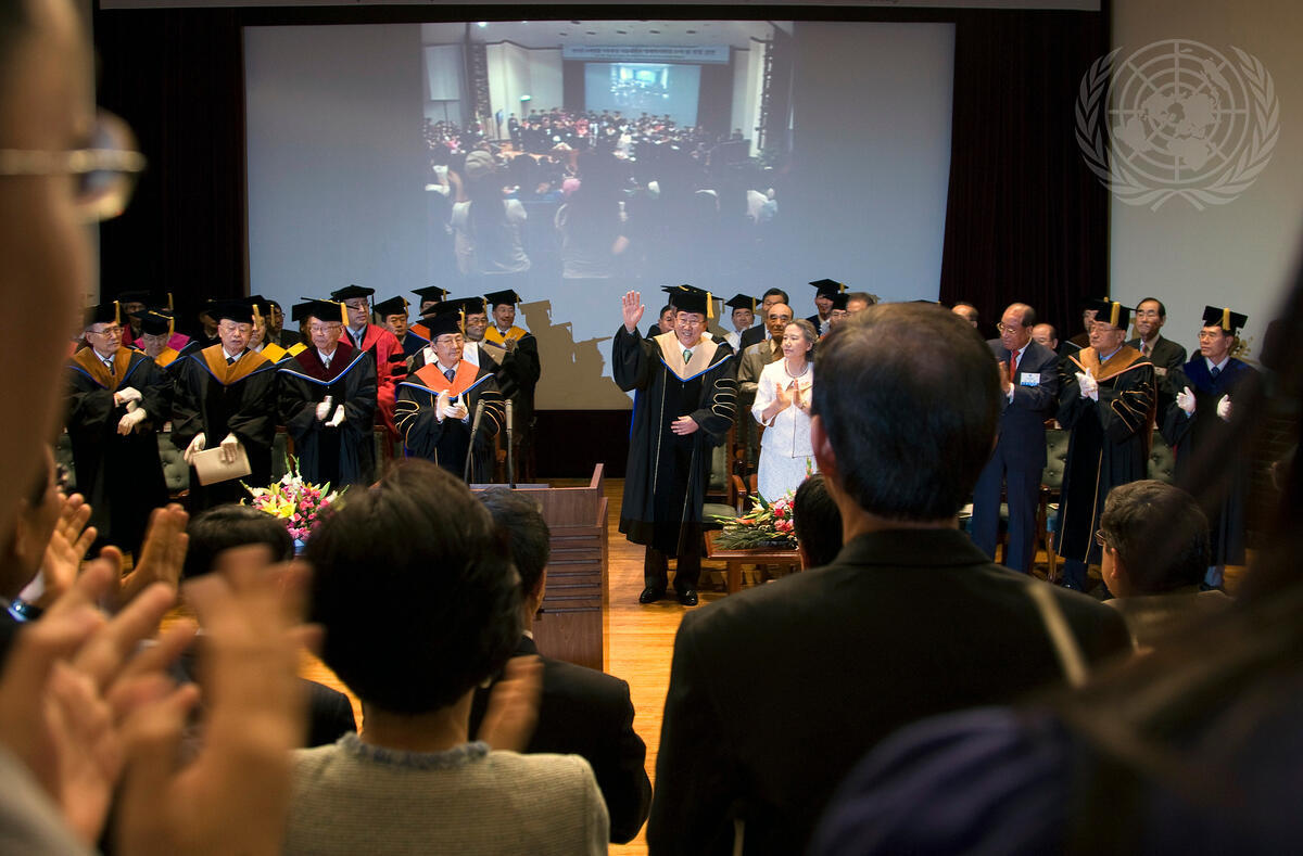 Secretary-General Ban Ki-moon waves to the audience, after receiving an honorary doctorate degree from the Seoul National University.llowing his receiving an honorary doctorate from the institution.