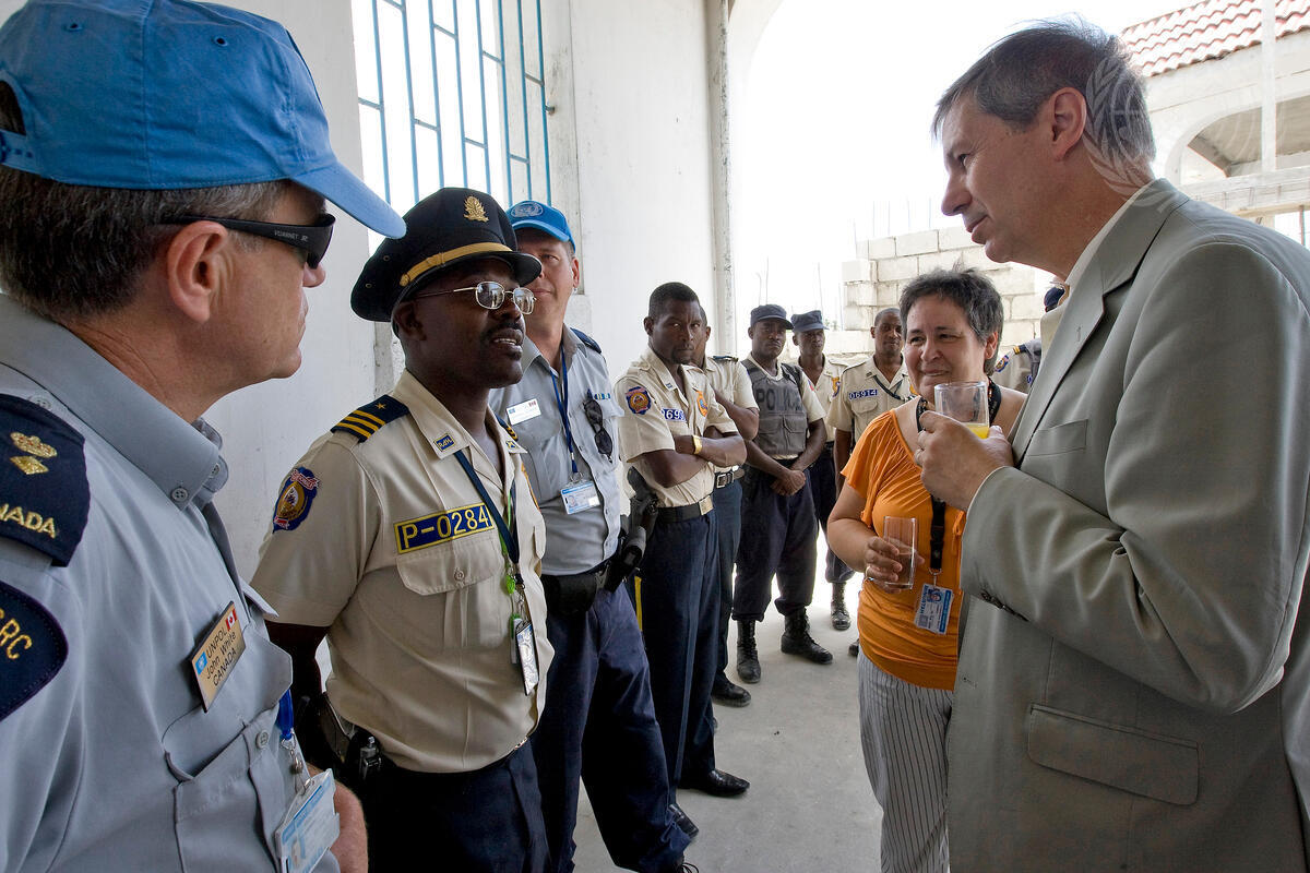 Jean-Marie Guéhenno (right), Under-Secretary-General for Peacekeeping Operations, listens to a Haitian police officer, and other military staff of the United Nations Stabilization Mission in Haiti (MINUSTAH) during his 48-hour visit.