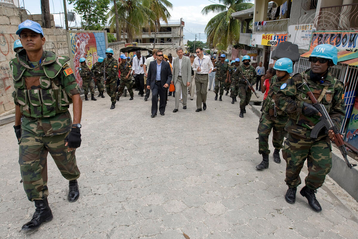 Jean-Marie Guéhenno (centre),Under-Secretary-General for Peacekeeping Operations, under the protection of the military personnel of the United Nations Stabilization Mission in Haiti (MINUSTAH) walks through the streets of the city during his 48-hour visit.
