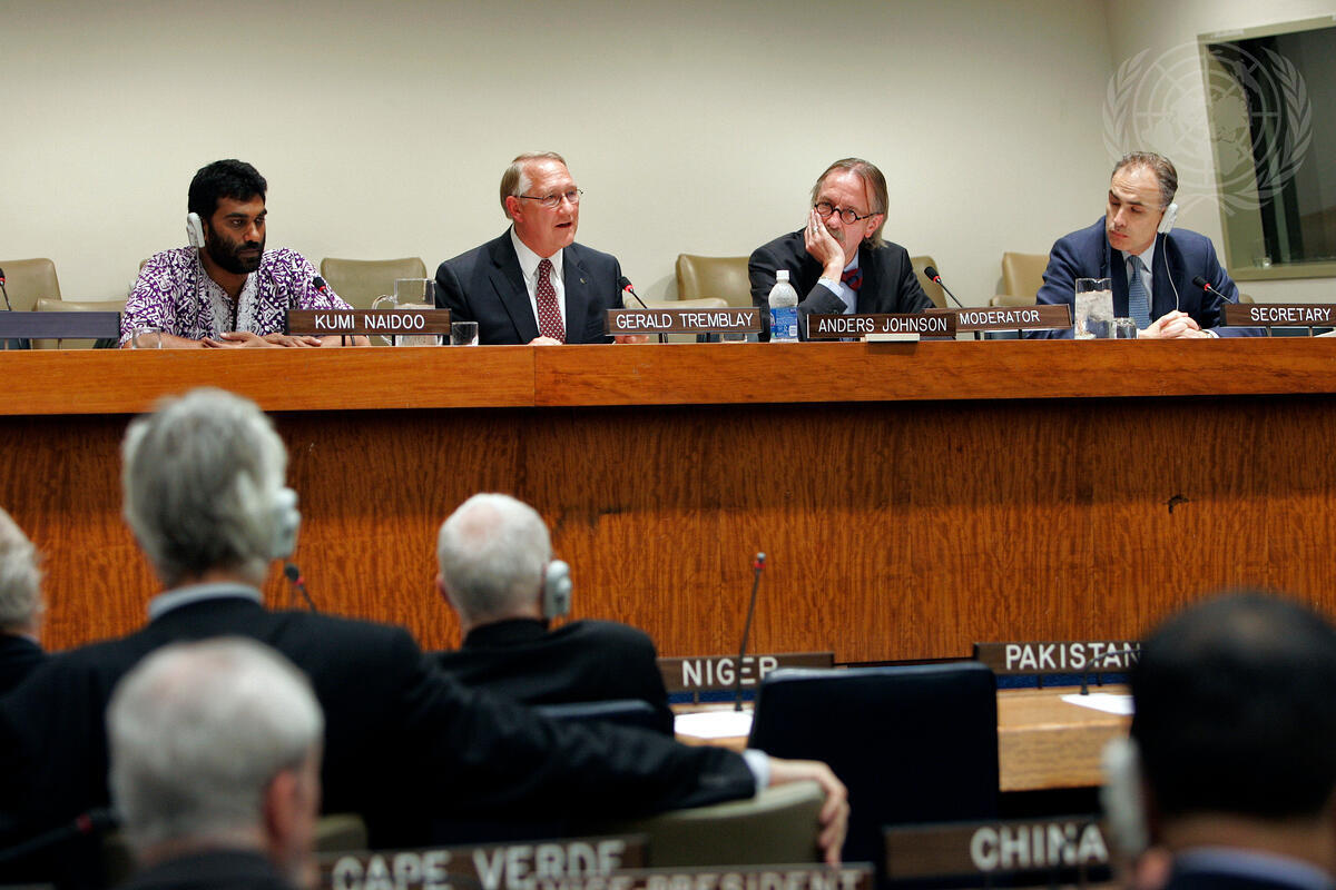 Gérald Tremblay, Mayor of Montreal and Chair of the Montreal Metropolitan Community and Vice-President of the United Cities and Local Governments, addresses the special presentation of the Economic and Social Council (ECOSOC) on the ""Key policy messages and recommendations of the Rome Stakeholder Forum."" Other participants on the podium with him (from left to right): Kumi Naidoo, Chief Executive of CIVICUS: World Alliance for Citizen Participation, and Anders Johnson, Secretary-General of the Inter-Parliamentary Union.