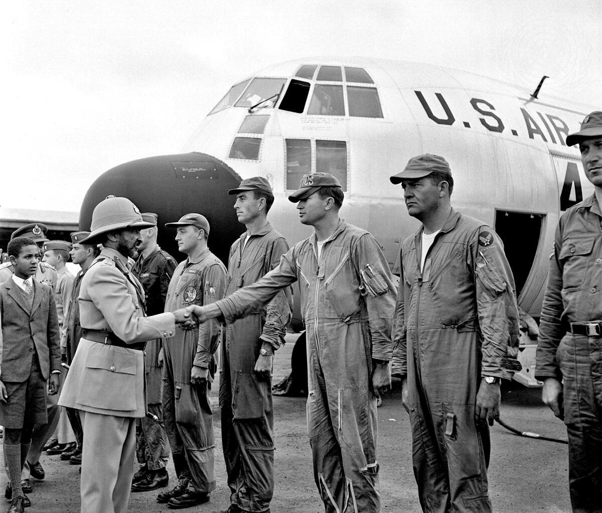 Before the departure of Ethiopian troops for the Congo, Emperor Haile Selassie I is greeting United States air force pilots. The U.S. is one of the countries helping to airlift troops to the Congo.
