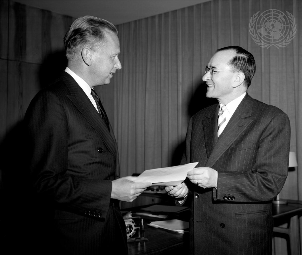 Ambassador Georges Hakim (right), Lebanon's new Permanent Representative to the United Nations, presented his credentials today to UN Secretary-General Dag Hammarskjöld.