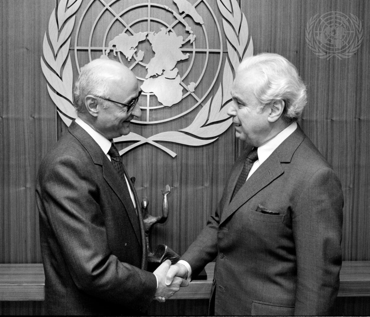 Khalil Makkawi, the new Permanent Representative of Lebanon to United Nations presents his credentials to Secretary-General Javier Perez de Cuellar (right).