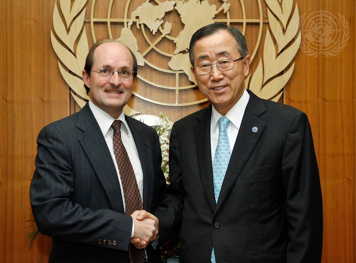 Christopher Coleman (left), Principal Officer in the Executive office of the Secretary-General, pays a farewell call on Secretary-General Ban Ki-moon.