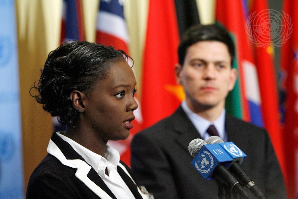Rama Yade (left), Minister of State for Foreign Affairs and Human Rights of France, flanked by David Miliband, Secretary of State for Foreign and Commonwealth Affairs of the United Kingdom of Great Britain and Northern Ireland, speaks to journalists prior to a Security Council meeting on post-conflict peacebuilding.