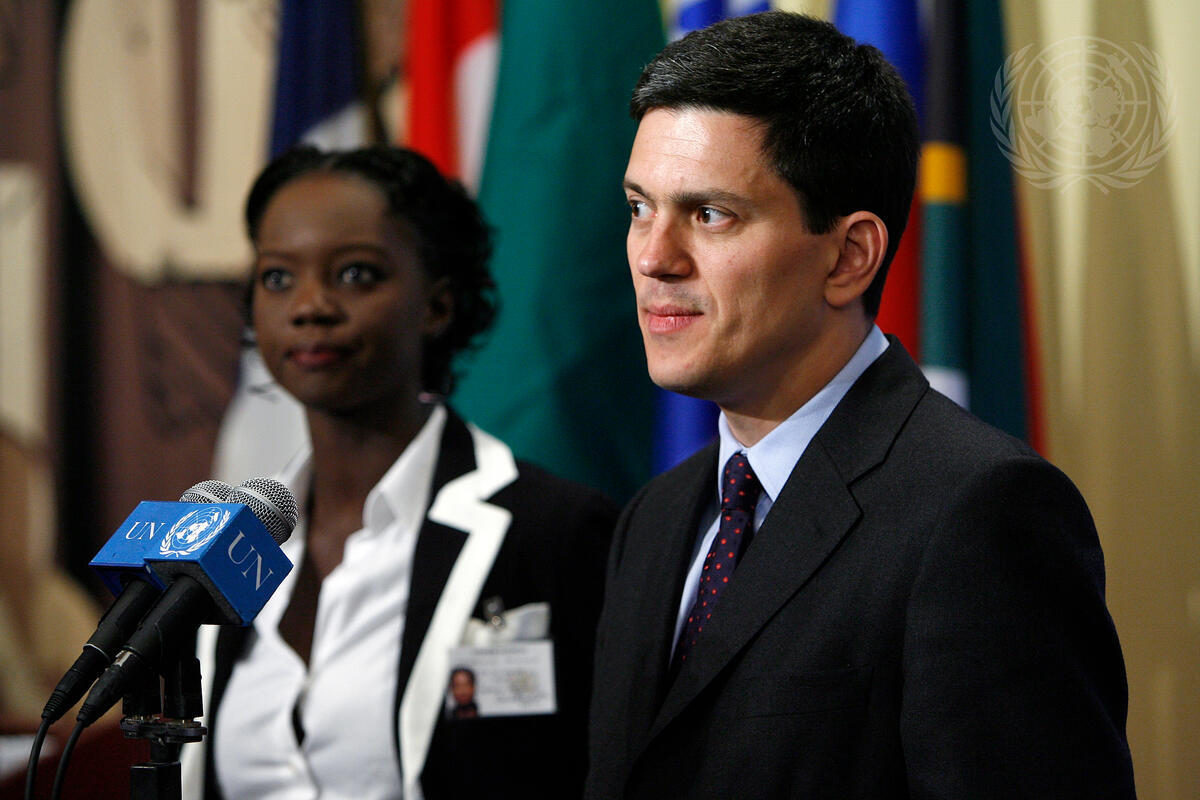 David Miliband, Secretary of State for Foreign and Commonwealth Affairs of the United Kingdom of Great Britain and Northern Ireland, flanked by Rama Yade (left), Minister of State for Foreign Affairs and Human Rights of France, speaks to journalists prior to a Security Council meeting on post-conflict peacebuilding.