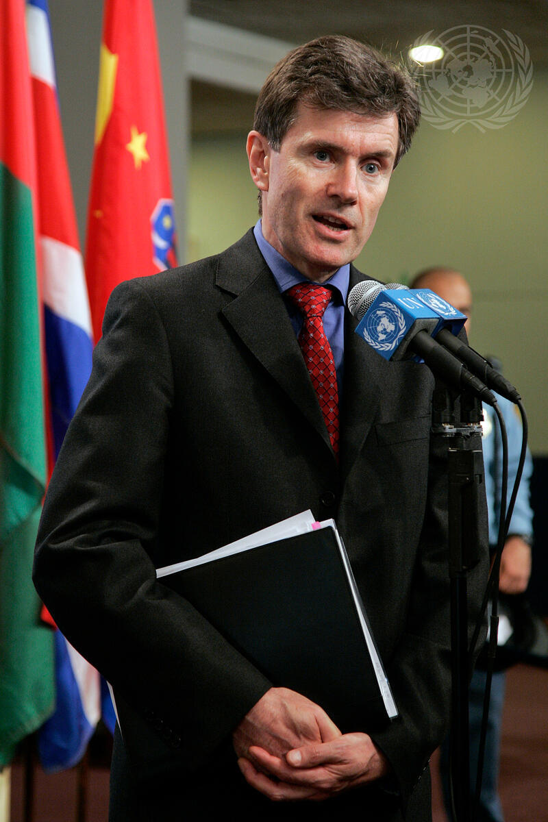 John Sawers, Permanent Representative of the United Kingdom of Great Britain and Northern Ireland, and President of the Security Council for May, briefs correspondents following a meeting on the plans for a United Nations takeover of the African Union peacekeeping mission, and the movement of the UN authority from Nairobi to Somalia.