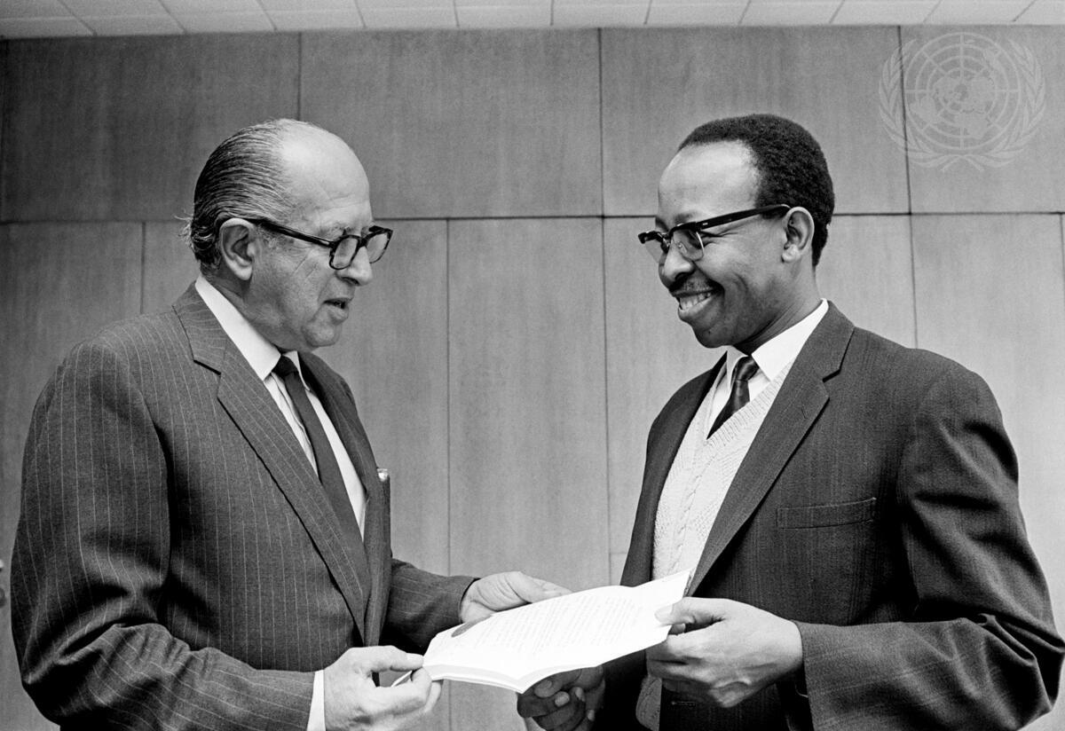 Mr. C. A. Stavropoulos (left), UN Legal Counsel, receiving the instruments