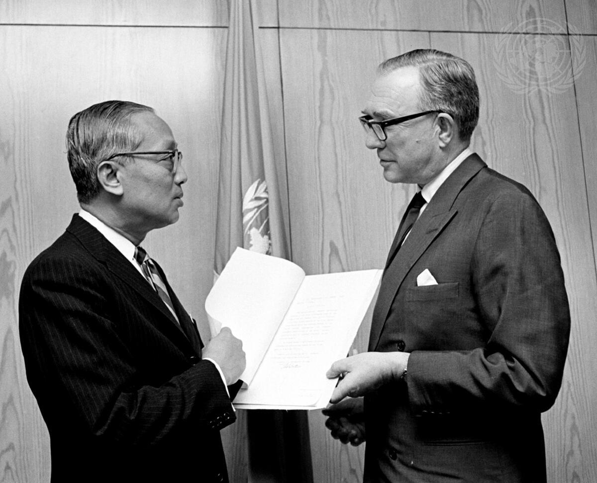 Ambassador Edvard Hambro (right), Permanent Representative of Norway to the UN, depositing the instrument of accession with Secretary-General U Thant.