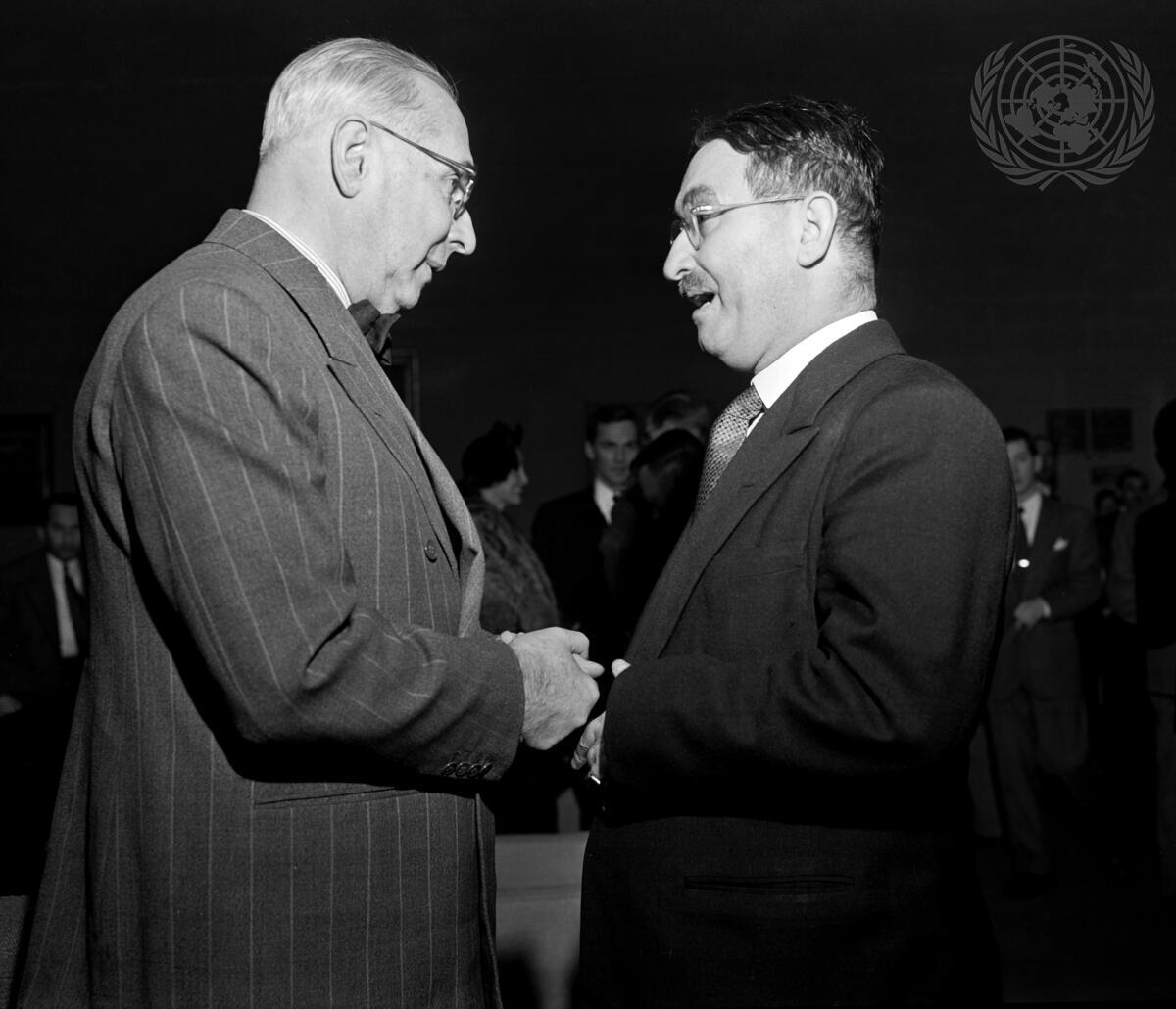 Dr. Mohamed Fadhil Jamali, right, Iraqi delegation vice-chairman, talks with Dr. Alfonso Lopez, Permanent Representative of Colombia to the United Nations, delegation chairman, in the lounge before the final meeting of the Second Session of the United Nations General Assembly.