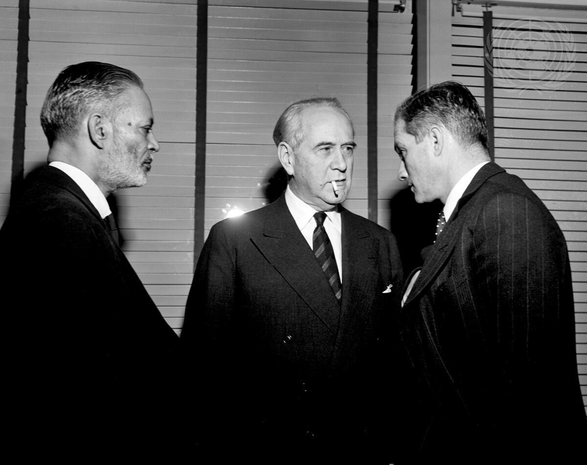 Before the last meeting of the Second Session of the United Nations General Assembly, Camille Chamoun, right, Lebanon, delegation chairman, talks to Dr. Oswaldo Aranha, centre, Brazil, President of the Assembly, as Sir M. Zafrullah Khan, Pakistan, delegation chairman, looks on.