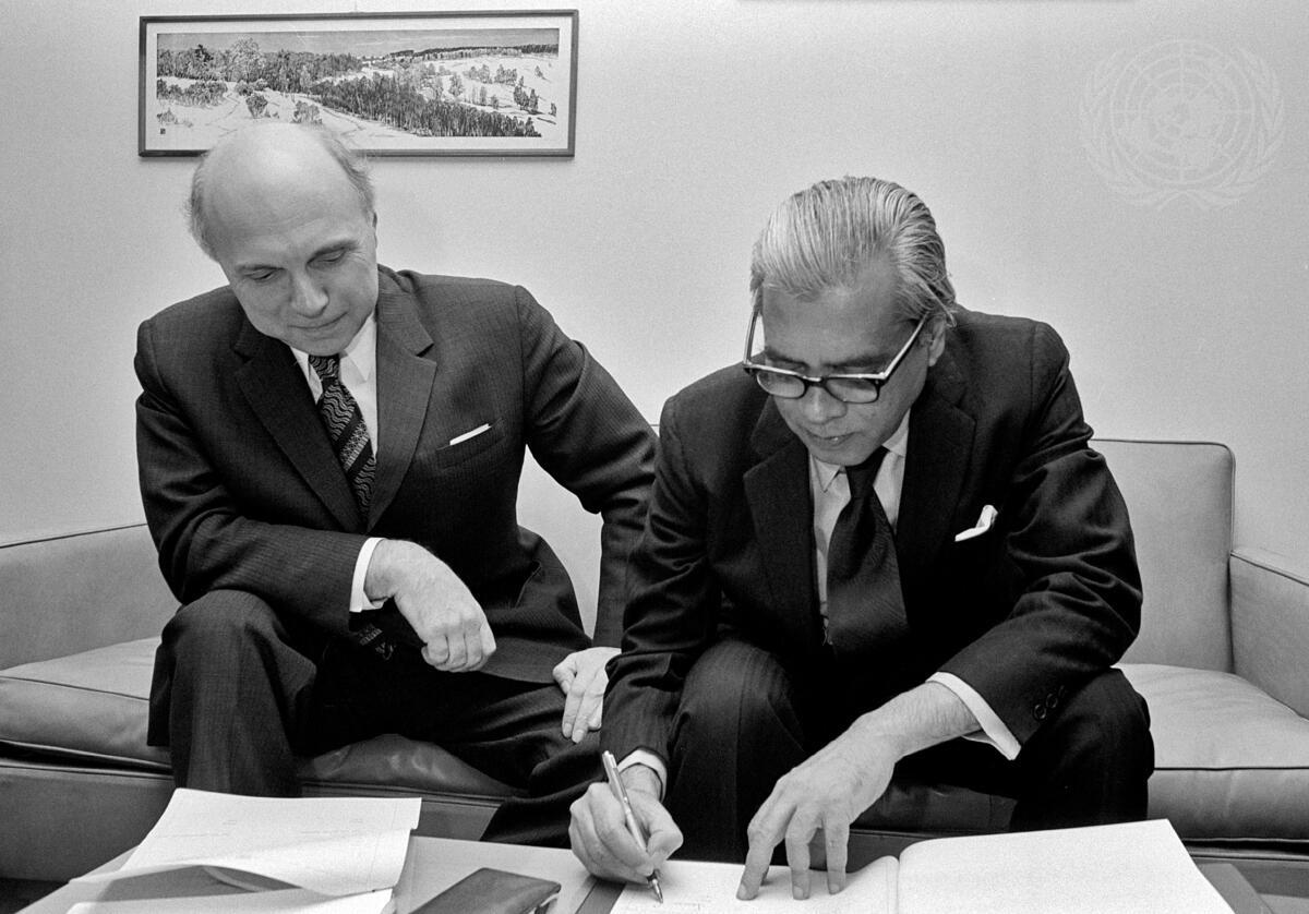 Ambassador Samar Sen, Permanent Representative of India, signing the agreement on behalf of his government, the Host Government for the meeting. Seated next to him is Mr. Leonid Kutakov, Under-Secretary-General for Political and Security Council Affairs, who signed on behalf of the U.N.