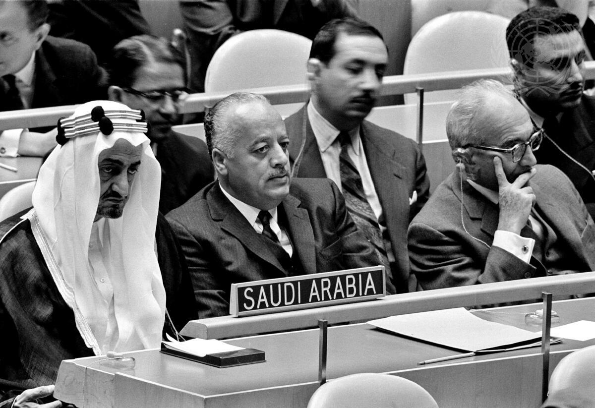 Members of the Delegation of Saudi Arabia, photgraphed as they attended this morning's plenary meeting of the United Nations General Assembly. Heading the Delegation is Prince Faisal (left, at desk). Seated beside him is Mr. Ahman Shukairy, Minister of State for United Nations Affairs and Permanent Representative to the U.N.