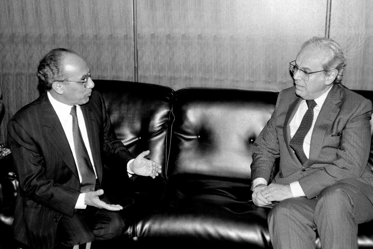 UN Secretary-General Javier Perez de Cuellar (right) meeting today at UN Headquarters with Dr. Abdulkarim Al Eryani, Minister for Foreign Affairs of the Yemen Arab Republic. The Foreign Minister is here to address the 43rd session of the United Nations General Assembly.