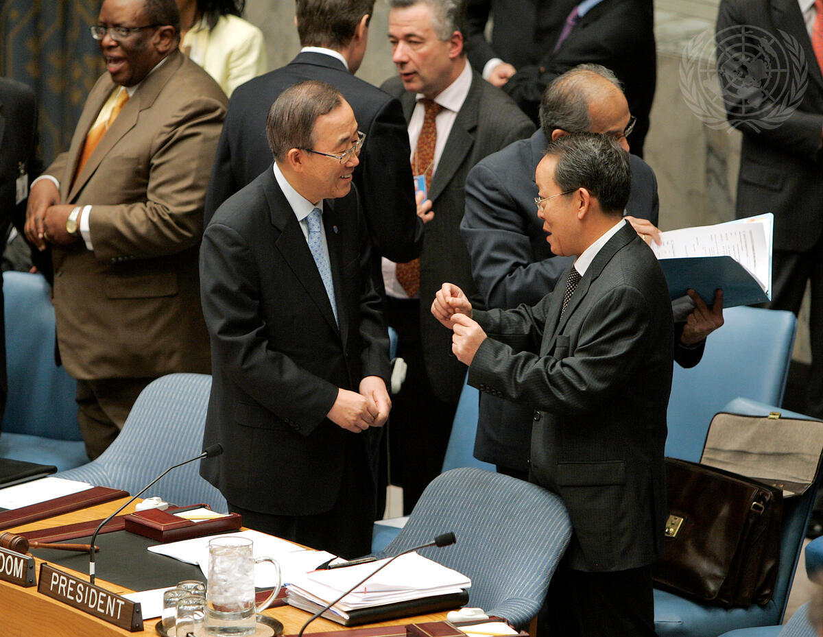 Secretary-General Ban Ki-moon (third from left) speaks with Guangya Wang (third from right), Permanent Representative of the People's Republic of China to the United Nations, prior to a Security Council meeting on post-conflict peacebuilding.