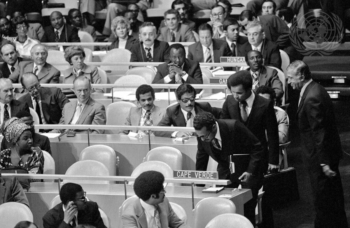 Sinan Korle (right), Chief or Protocol, escorting the delegation of Cape Verde to its place in the Assembly Hall.