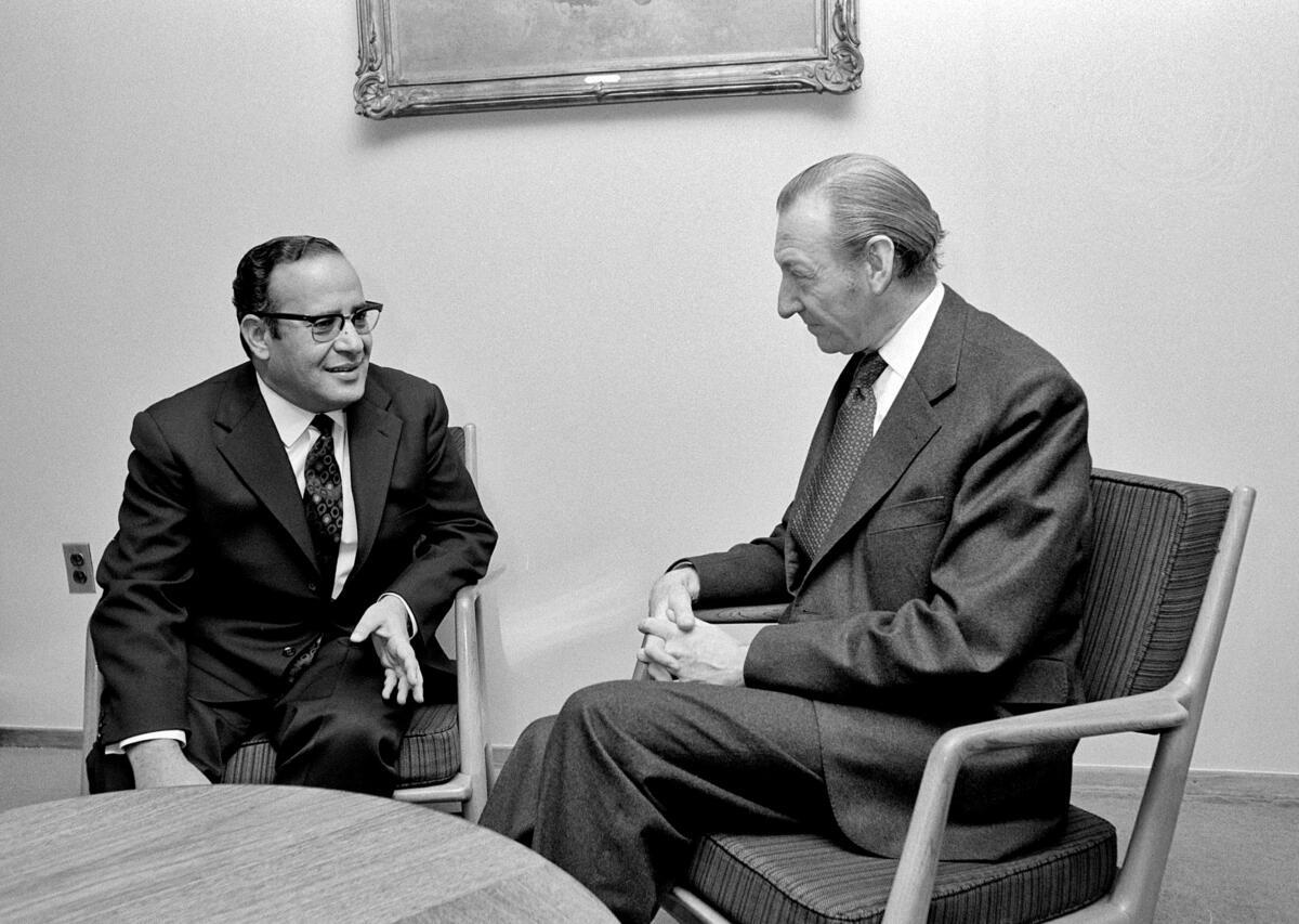 Mohsen Alaini (left), Prime Minister of Yemen, is seen as he met with Secretary-General Kurt Waldheim, during his visit to United Nations Headquarters today.