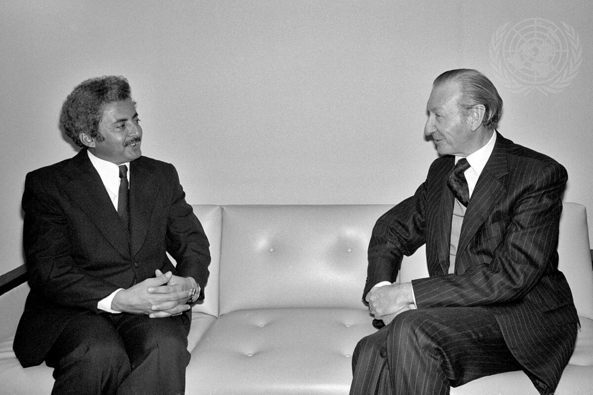 Chairman Salem Robaye Ali (left) and Secretary-General Kurt Waldheim conferring at the United Nations today.
