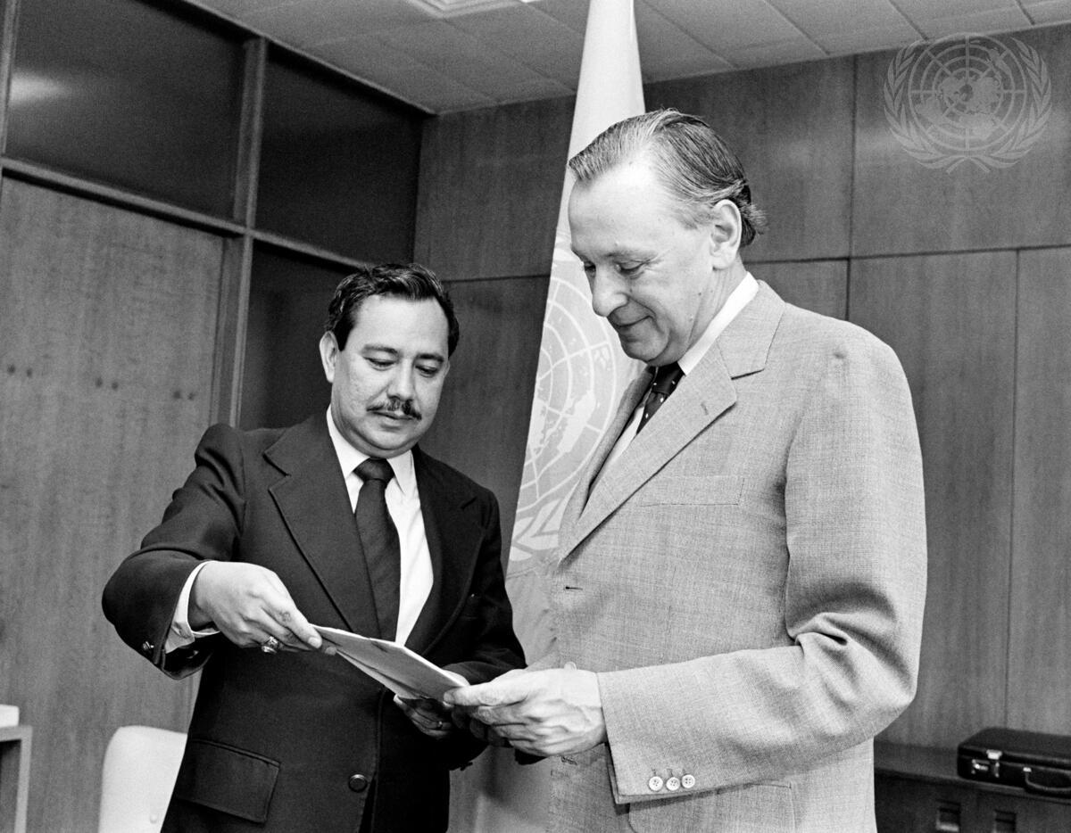 UN Ambassador Mauricio Rosaless of El Salvador (left) depositing the instrument of accession with UN Legal Counsel Carl-August Fleishhauer.