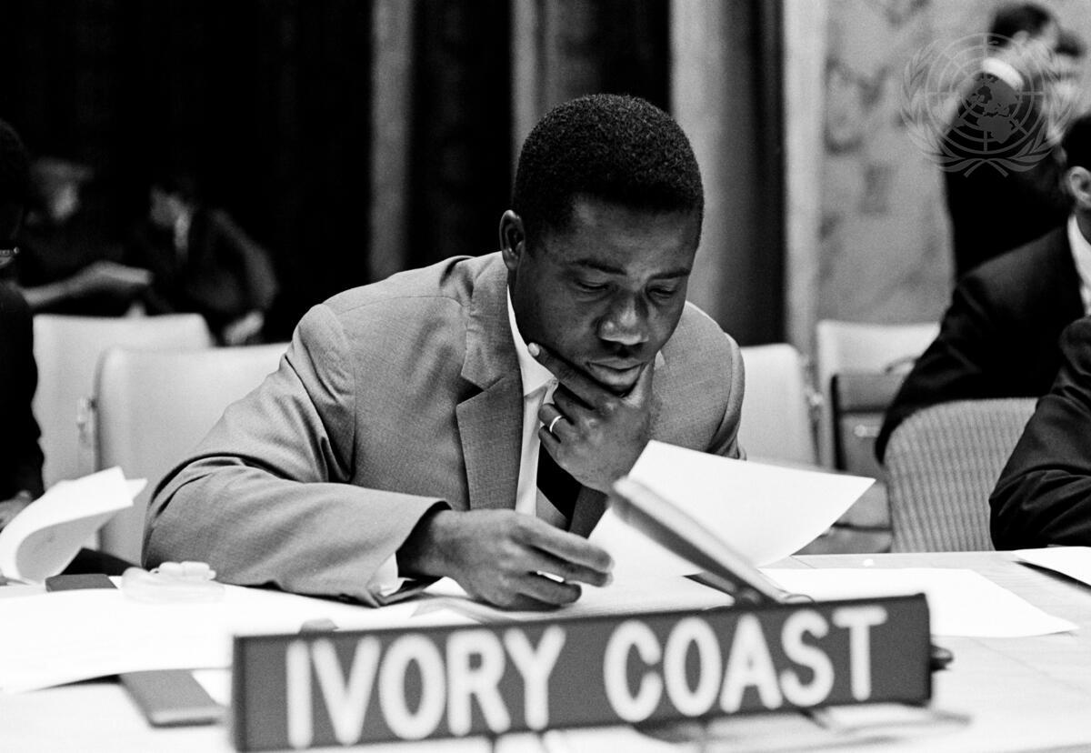 Caption Description The Security Council met this morning to continue consideration of the situation in the Dominican Republic. This is the Council's 21st meeting on this question. Here, studying a document, is Mr. Moise Aka of the Ivory Coast.