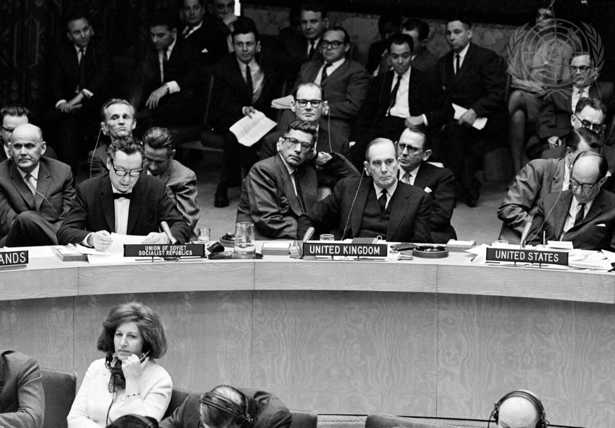 Dr. Nikolai T. Fedorenko (left) of the USSR, addressing the Council. At the table with him are Lord Caradon (centre) of the United Kingdom, and Mr. Adlai E. Stevenson of the United States.
