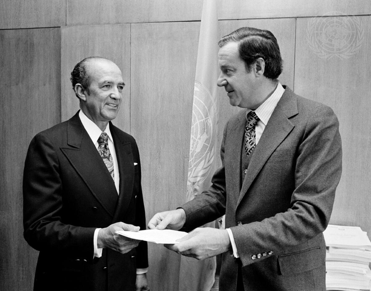 Panama has acceded to the Convention relating to the Status of Refugees and the Protocol relating to the Status of Refugees. Ambassador Jorge E. Illulga, Permanent Representative of Panama to the UN, presenting the instrument of accession to Erik Suy, Under-Secretary-General for Legal Affairs (right).