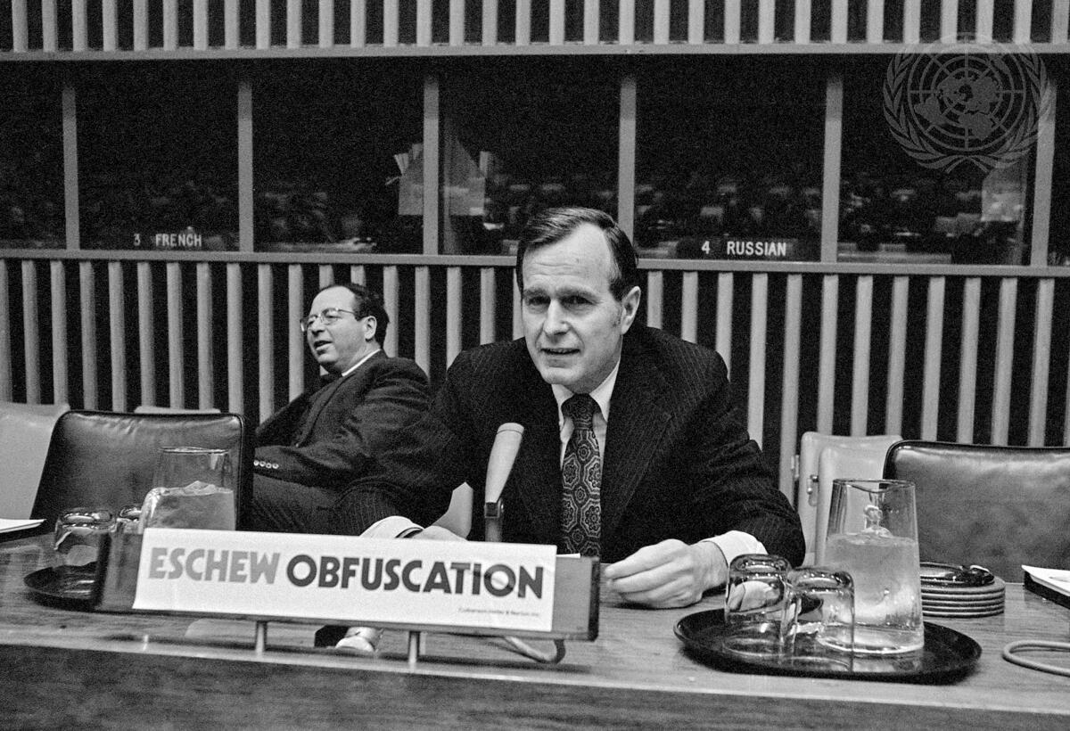 George Bush, Permanent Representative of the United States, is seen at his press conference held at United Nations Headquarters today prior to leaving his post on 15 January 1973. Mr. Bush inserted a red, white and blue sign reading ""Eschew Obfuscation"" before him in the Chairman's seat in Conference Room 4 and said that when a session was termed ""dull"" it was perhaps not altogether a bad thing because it indicated there was less confrontation.