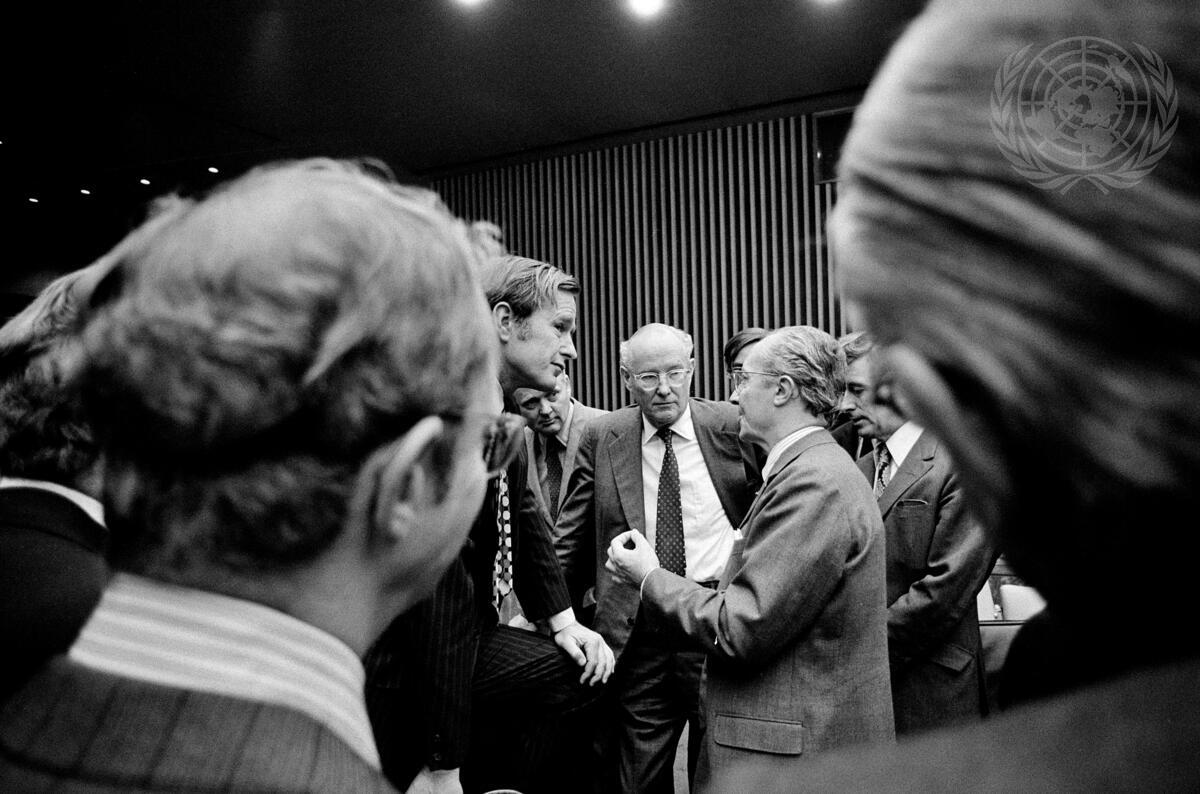 At centre, conferring are (left to right): George Bush (United States), Sir Collin Crowe (United Kingdom) and Louis de Guiringaud (France).