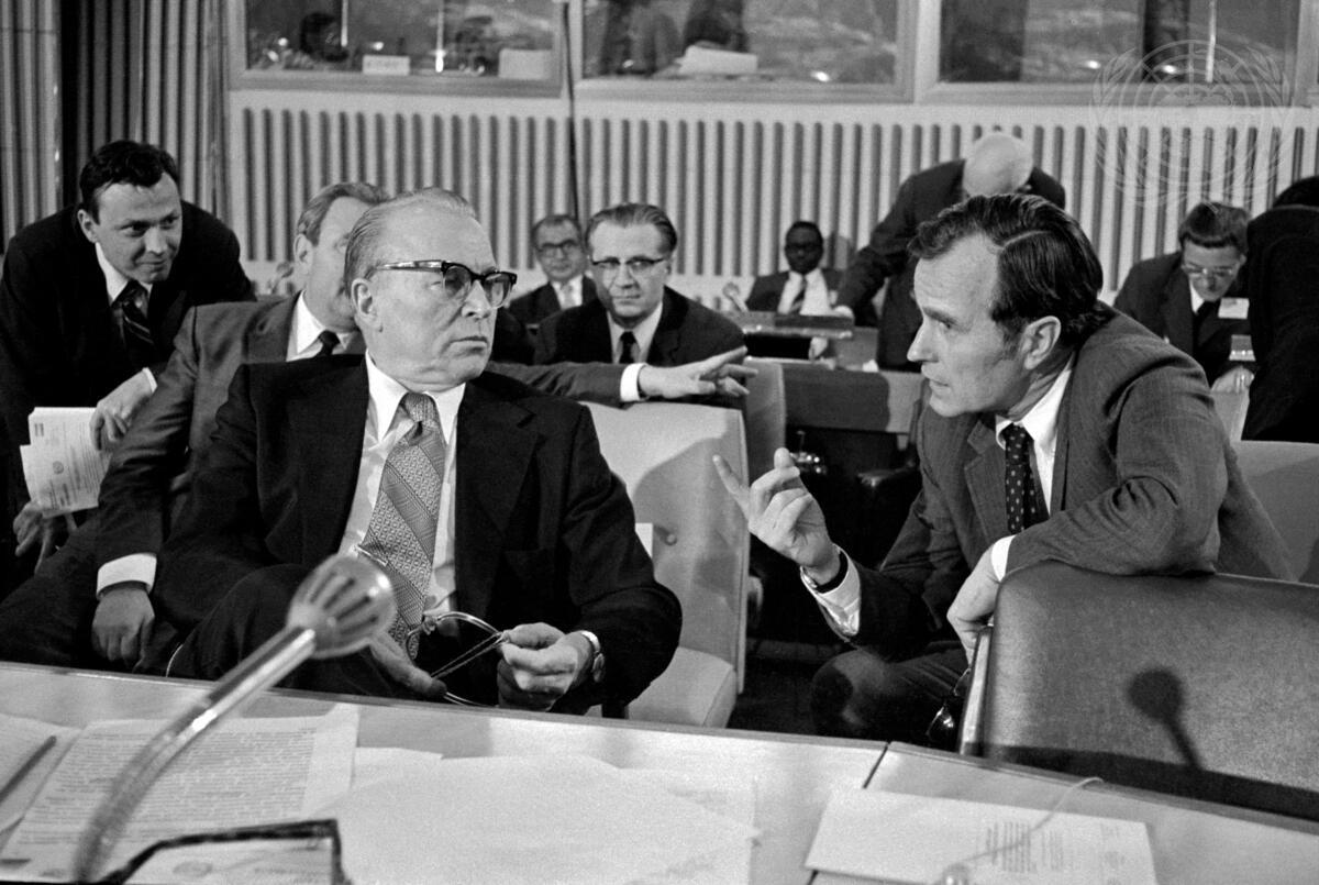 The Security Council opened its first meetings in Africa on 28 January in Addis Ababa; the Council's first meetings away from UN Headquarters in 20 years. Yakov A. Malik (left) of the Soviet Union conferring with George Bush of the United States during the meeting.