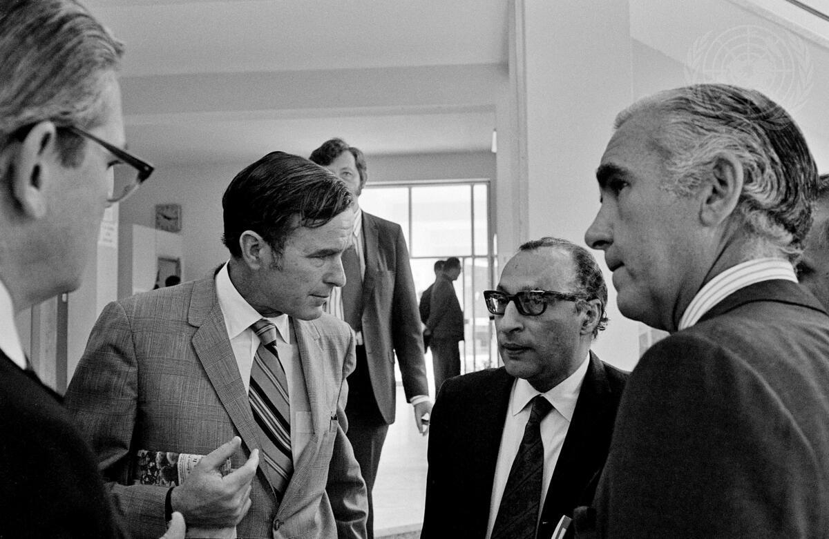 The Security Council opened its first meetings in Africa on 28 January in Addis Ababa; the Council's first meetings away from UN Headquarters in 20 years. Conferring, before the meeting began, from left to right: Michael Newlin (United States), George Bush (United States), Aga Shahi (Pakistan), President of the UN Council for Namibia, and Carlos Ortiz de Rozas (Argentina).