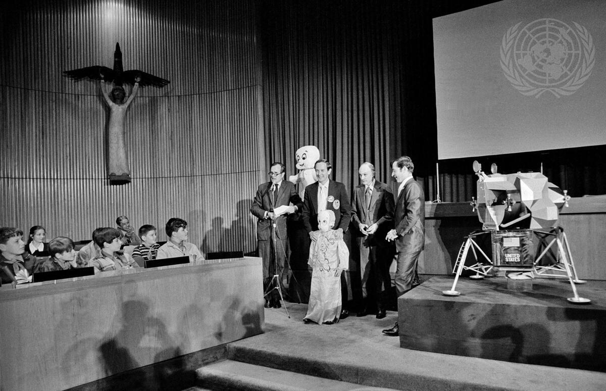 The astronauts are seen here during their meeting with the students. Left to right: Ambassador George Bush, Permanent Representative of the United States to the UN; Colonel Charles Duke; Commander Thomas Mattingly; and Captain John Young. Dressed as the cartoon character ""Casper the Friendly Ghost"" is Adam Harvey of UNIS.
