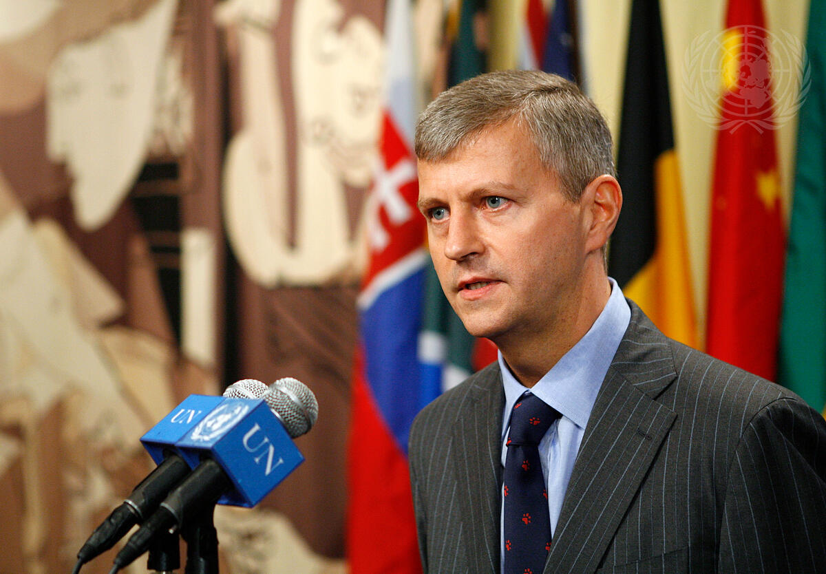 Jean-Pierre Lacroix, Deputy Permanent Representative of France to the United Nations, briefs correspondents following the Security Council meeting on the situations in Georgia, Myanmar, and other matters, at UN Headquarters in New York.