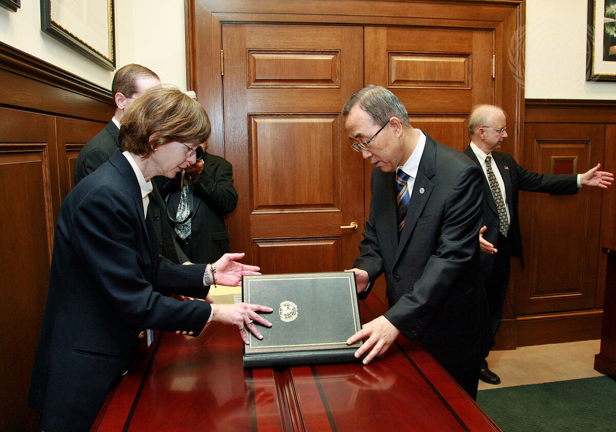 Secretary-General Ban Ki-moon (right) holds the original Charter of the United Nations during a visit to the US National Archives.