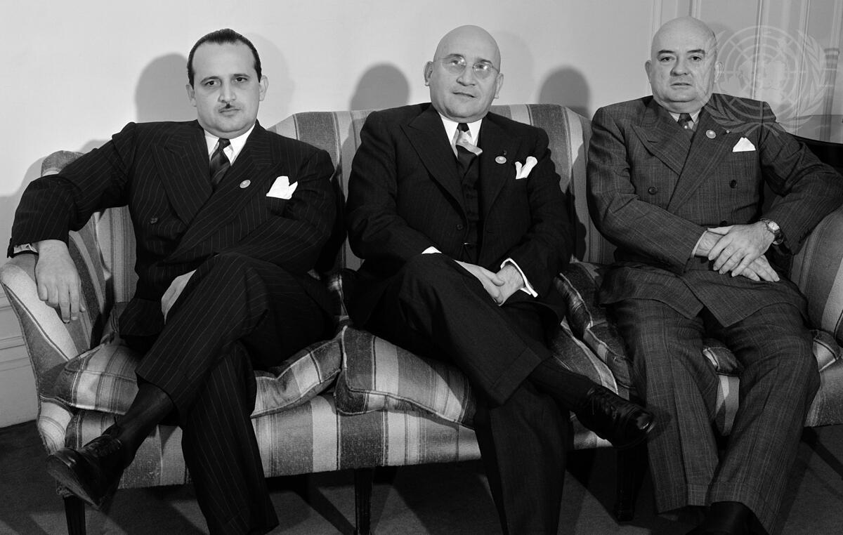 Members of the delegation from Nicaragua at the Hotel St. Francis. Seated from left to right are Guillermo Sevilla Sacasa, Mariano Arguello Vargas, Luis Manuel de Bayle. [No exact date]