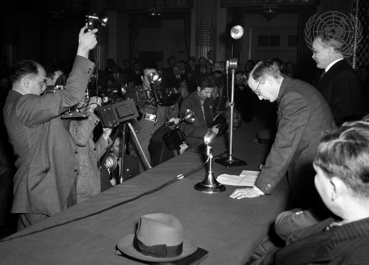 Photographers and newsmen at the final press conference of V.M. Molotov, Chairman of the USSR Delegation, at the St. Francis Hotel. [no date]