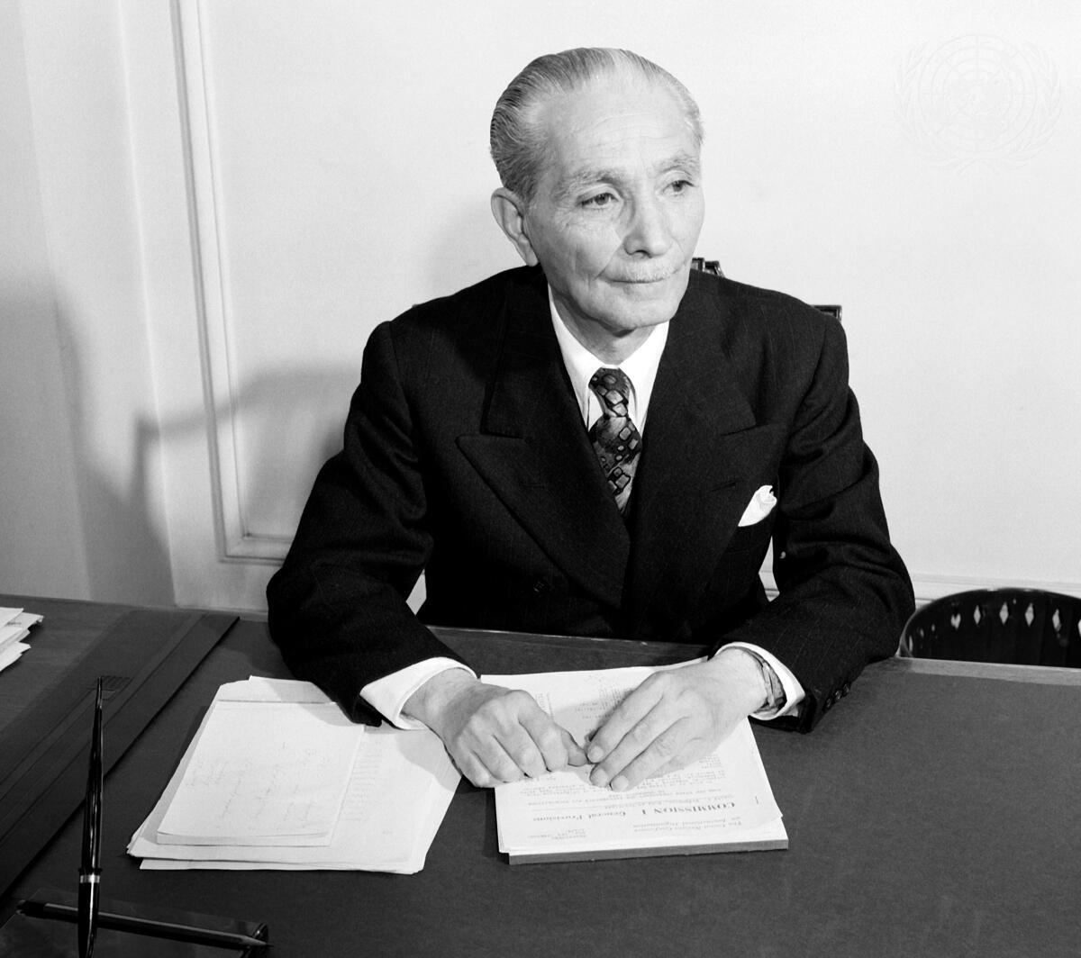 Mostafa Adle, Chairman of the Delegation from Iran in his room at the Hotel St. Francis in San Francisco. [No exact date]