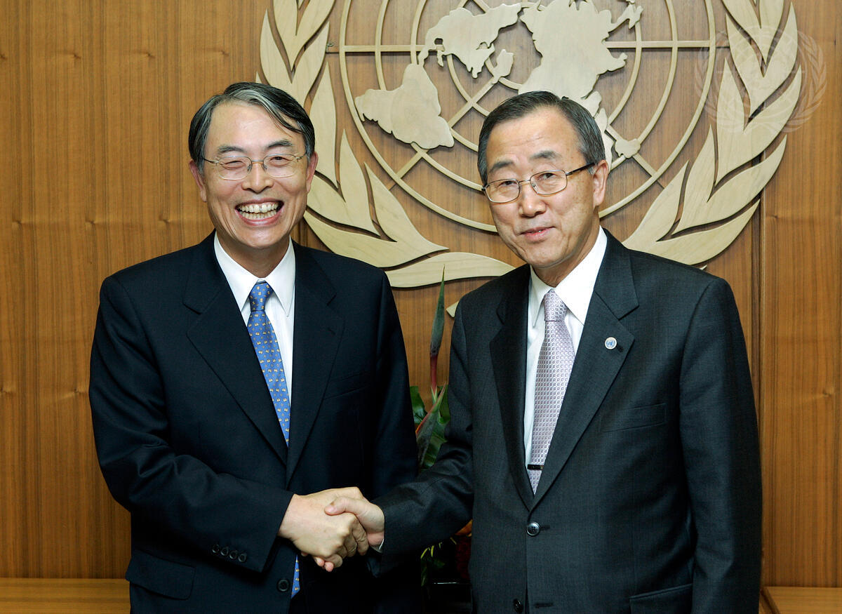 Secretary-General Ban Ki-moon (right) meets with Sang-Hyun Song, Judge of the International Criminal Court (ICC).