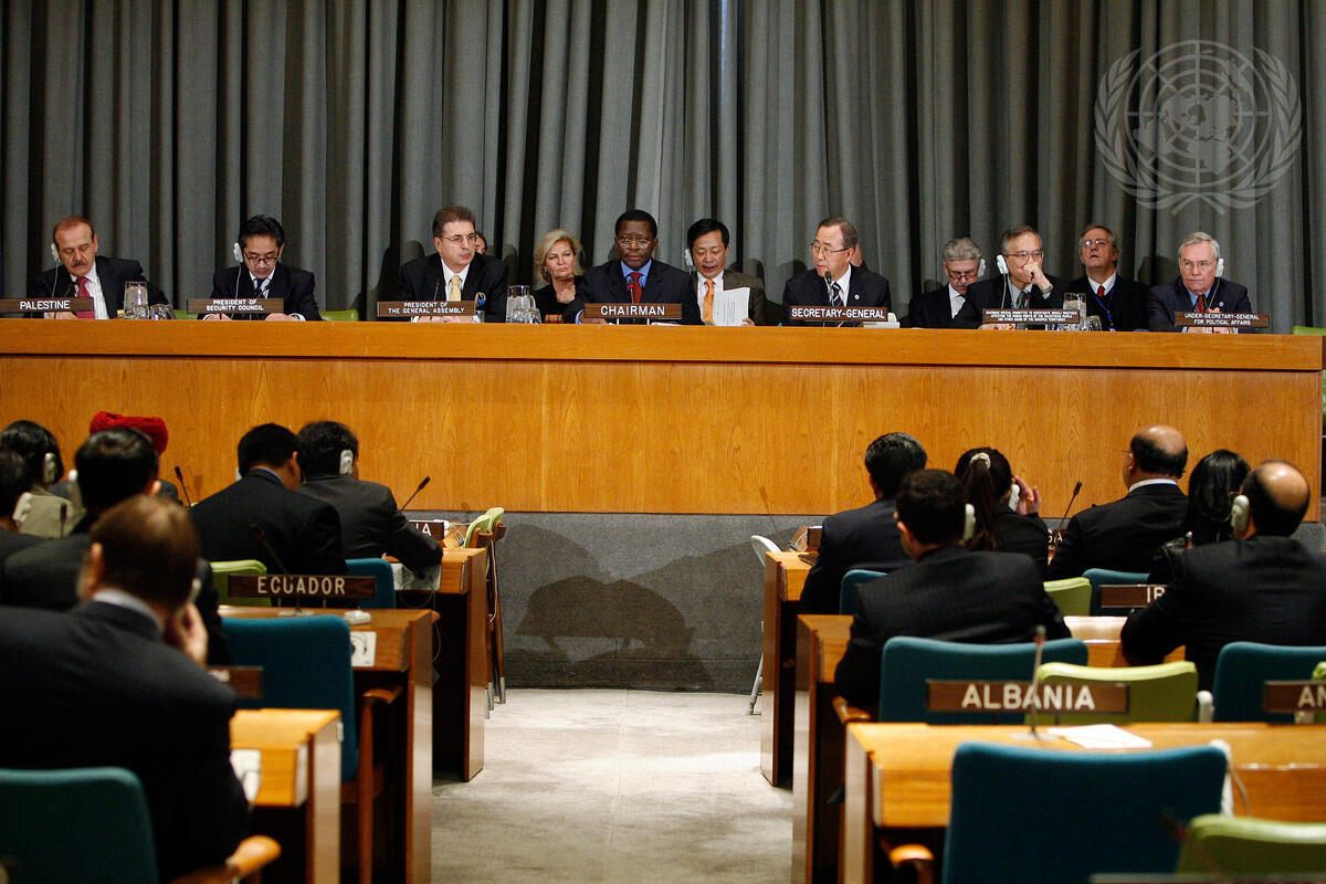 Secretary-General Ban Ki-moon (seventh from left) addresses the solemn meeting in observance of the International Day of Solidarity with the Palestinian People. Also at the podium with him (from left to right): Yasser Abed Rabbo, Secretary-General of the Executive Committee of the Palestinian Liberation Organization; Marty Natalegawa, Permanent Representative of Indonesia to the United Nations, and President of the Security Council for November; Srgjan Kerim, President of the sixty-second session of the General Assembly; Paul Badji, Permanent Representative of Senegal to the United Nations and Chairman of the Committee on the Exercise of the Inalienable Rights of the Palestinian People; Hamidon Ali, Permanent Representative of Malaysia to the United Nations and Vice Chairman of the Special Committee to Investigate Israeli Practices Affecting the Human Rights of the Palestinian People and Other Arabs of the Occupied Territories; and B. Lynn Pascoe, Under-Secretary-General for Political Affairs.