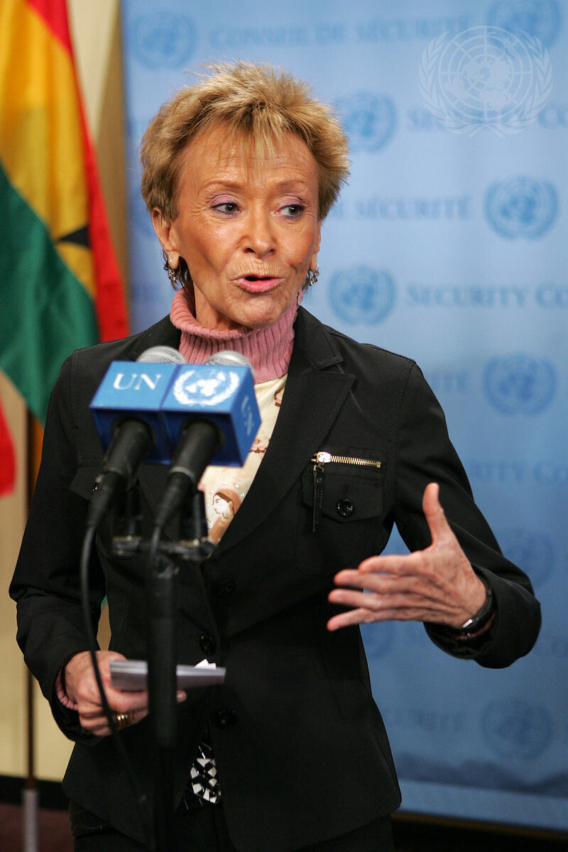 María Teresa Fernández de la Vega Sanz, Vice-President of the Government of Spain, briefs correspondents outside the Security Council chamber.