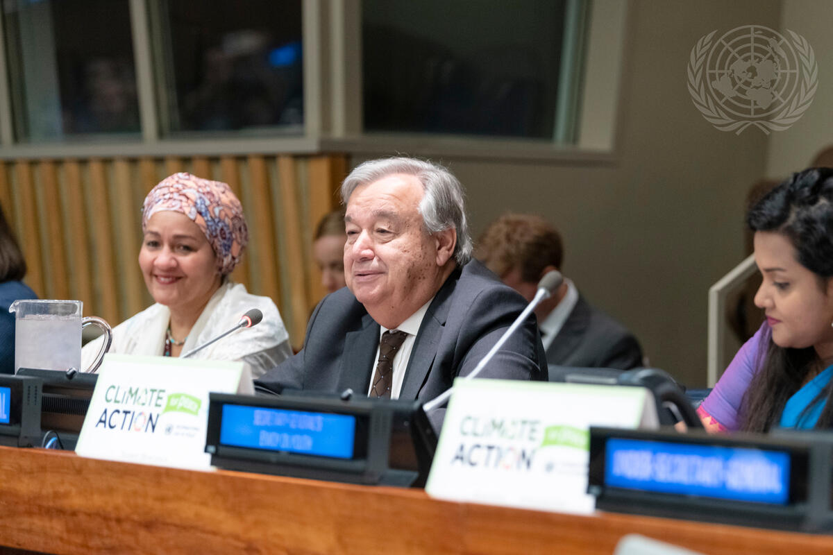 "Secretary-General António Guterres (centre) makes remarks at the student observance of the International Day of Peace (21 September). At left is Deputy Secretary-General Amina Mohammed, and at right is Jayathma Wickramanayake, Secretary-General's Envoy on Youth.