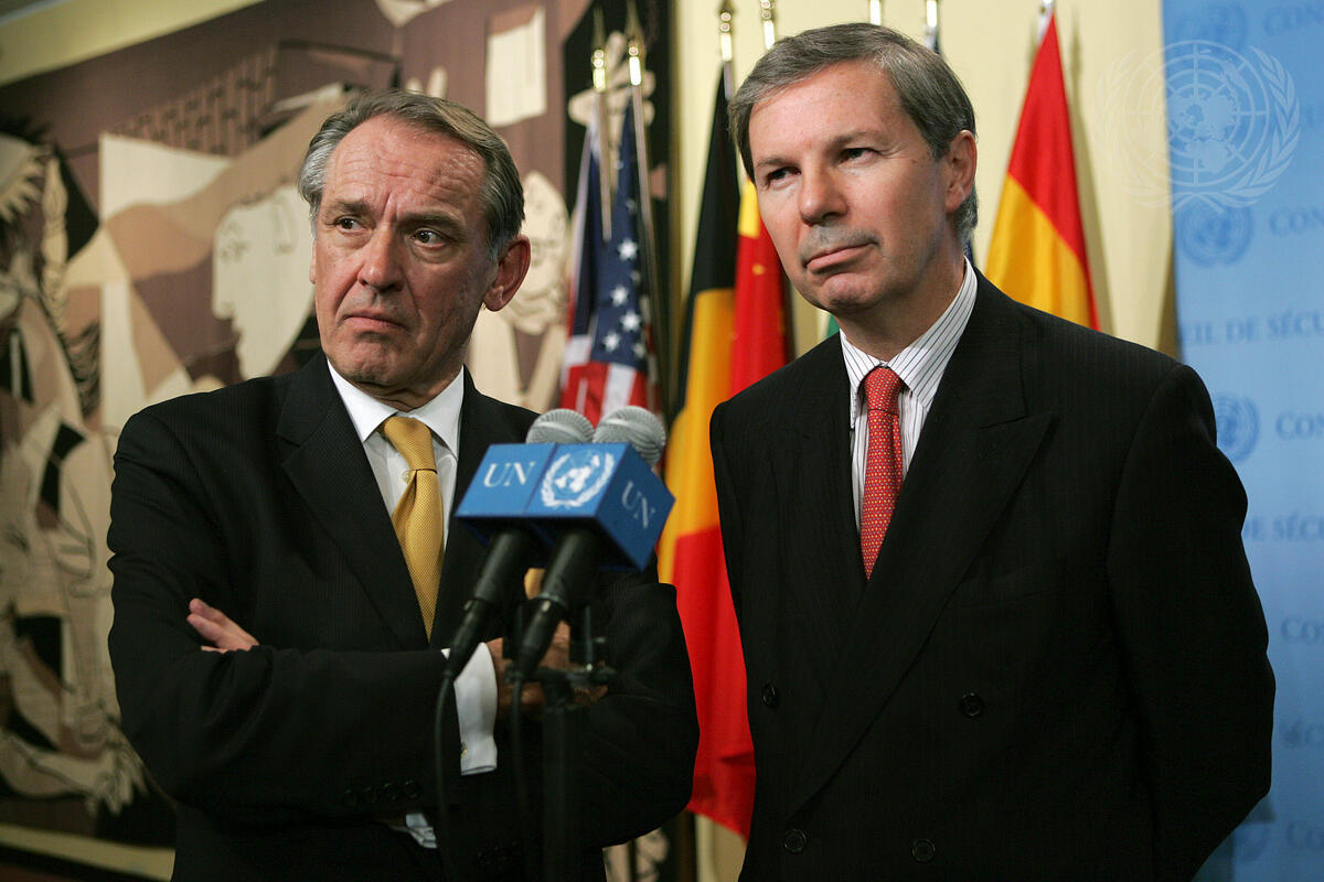 Jean-Marie Guéhenno, Under-Secretary-General for Peacekeeping Operations, flanked by Jan Eliasson, Special Envoy of the Secretary-General for Darfur, talks to news correspondents following the Security Council meeting on the deployment of the African Union-United Nations Hybrid Operation in Darfur.