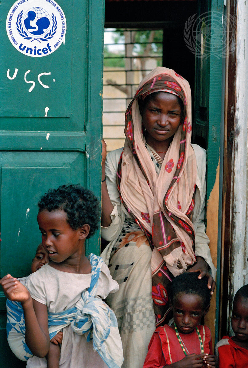 A young Somali mother and her children waiting for medical treatment in the doorway of a clinic run by UNICEF and Swede Relief. [October 1992]