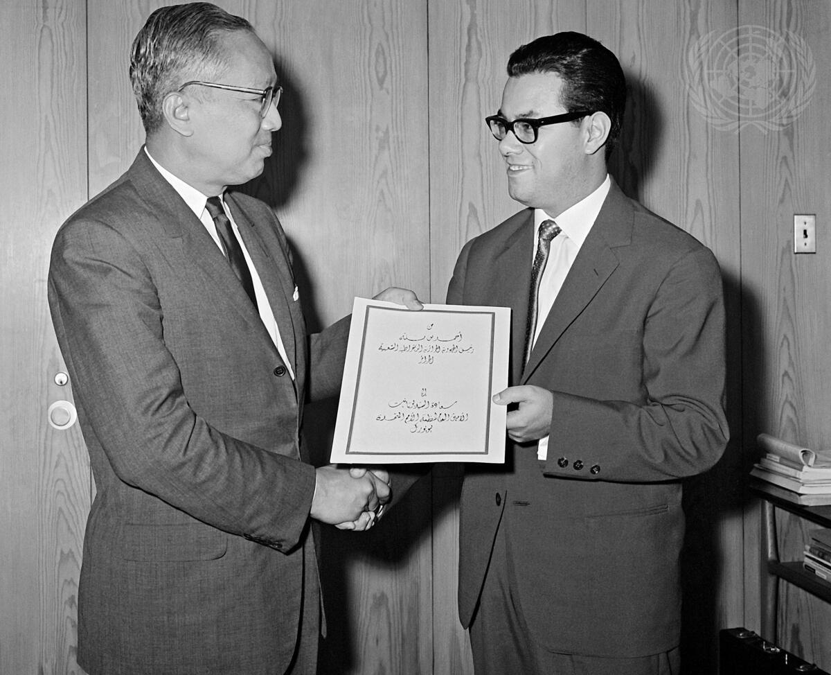 Ambassador Tewfik Bouattoura (right), new Permanent Representative of Algeria to the United Nations, is seen presenting his credentials to Secretary-General U Thant.
