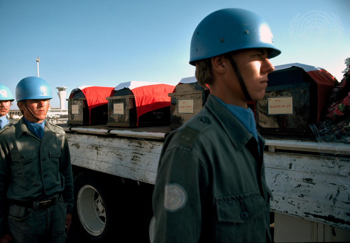 Partial view of the memorial service held at Damascus International airport for four Austrian soldiers who were killed in a mine accident on Mt. Hermon on 25 June. Bodies of the four soldiers were placed on a plane for repatriation to Austria.