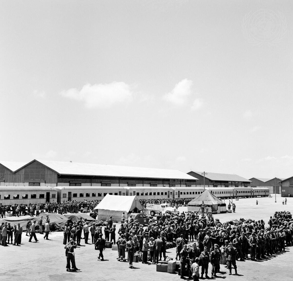 Members of the Yugoslav contingent which is being rotated after completing service with UNEF are seen here (foreground) on the UNEF pier in Port Said as they awaited the order to embark aboard the ""Yugoslavija"" for the trip home. In the background, their incoming counterparts line up near the railroad coaches in which they will travel to El Arish to begin service with UNEF.