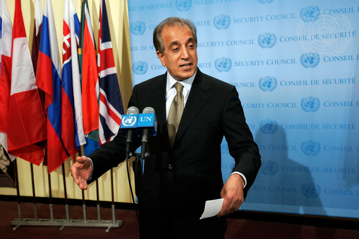 Zalmay Khalilzad, Permanent Representative of the United States to the United Nations and President of the Security Council for May, briefs correspondents outside the Security Council chamber, at UN Headquarters in New York.
