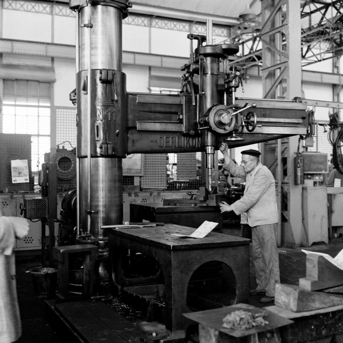 A worker using a large radial drill in the machine shop of the Port Fuad works. 1957.