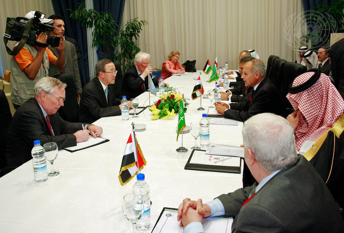 Right side of table from left to right: Hamad bin Jassem bin Jabor Al Thani, Prime Minister and Minister for Foreign Affairs of Qatar, Abdelelah Al-Khatib, Minister for Foreign Affairs of the Kingdom of Jordan; Amre M. Moussa, Secretary-General of the League of Arab States; Ahmed Aboul Gheit, Minister for Foreign Affairs of the Arab Republic of Egypt; Prince Saud Al-Faisal, Minister for Foreign Affairs of the Kingdom of Saudi Arabia and Walid al-Mouallem, Minister for Foreign Affairs of the Arab Republic of Syria, participate in a meeting on the Arab Peace Initiative, after the launch of the International Compact with Iraq in Sharm El-Sheikh, Egypt. UN Secretary-General Ban Ki-moon also attending the meeting is second from right on opposite side of table.